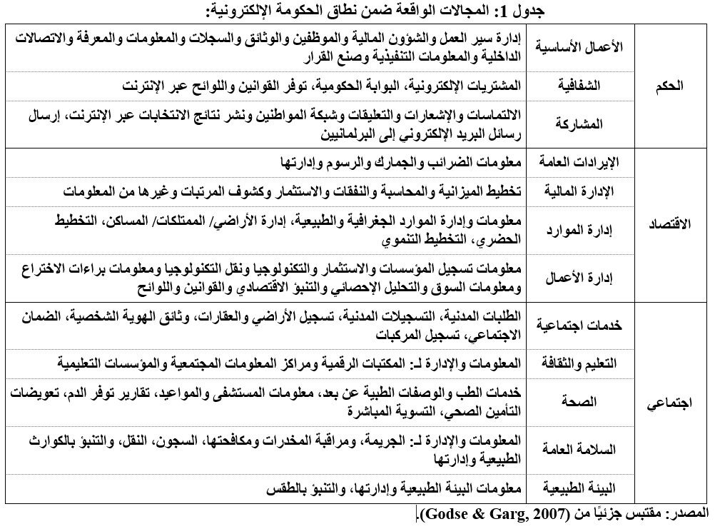 وتعد الحكومة الإلكترونية أحد مكونات تعزيز الديمقراطية والمؤسسات، وتعزيز الإنتاجية في الخدمات العامة، وتشجيع مشاركة المواطنين عن طريق منصة تكنولوجيا المعلومات والاتصالات في مختلف قضايا التنمية الوطنية، وتسهيل الاندماج الاجتماعي. في جوهر الأمر تؤثر الحكومة الإلكترونية في ثلاث مجالات مختلفة من التسلسل الهرمي للحوكمة: الحكم والاقتصاد والمجتمع، جدول (1) يوضح المجالات الواقعة ضمن نطاق الحكومة الإلكترونية.