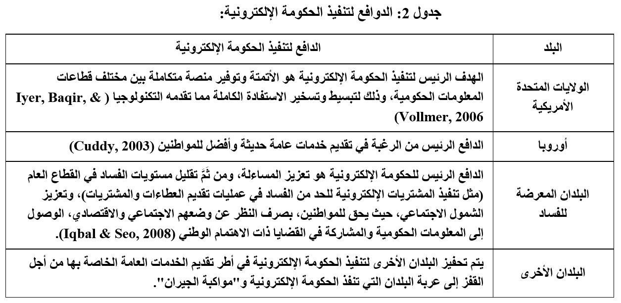 يمكن الافتراض أن الدوافع المحددة لتنفيذ الحكومة الإلكترونية في جميع أنحاء العالم ليست متجانسة. جدول 2 يوضح الدوافع لتنفيذ الحكومة الإلكترونية.