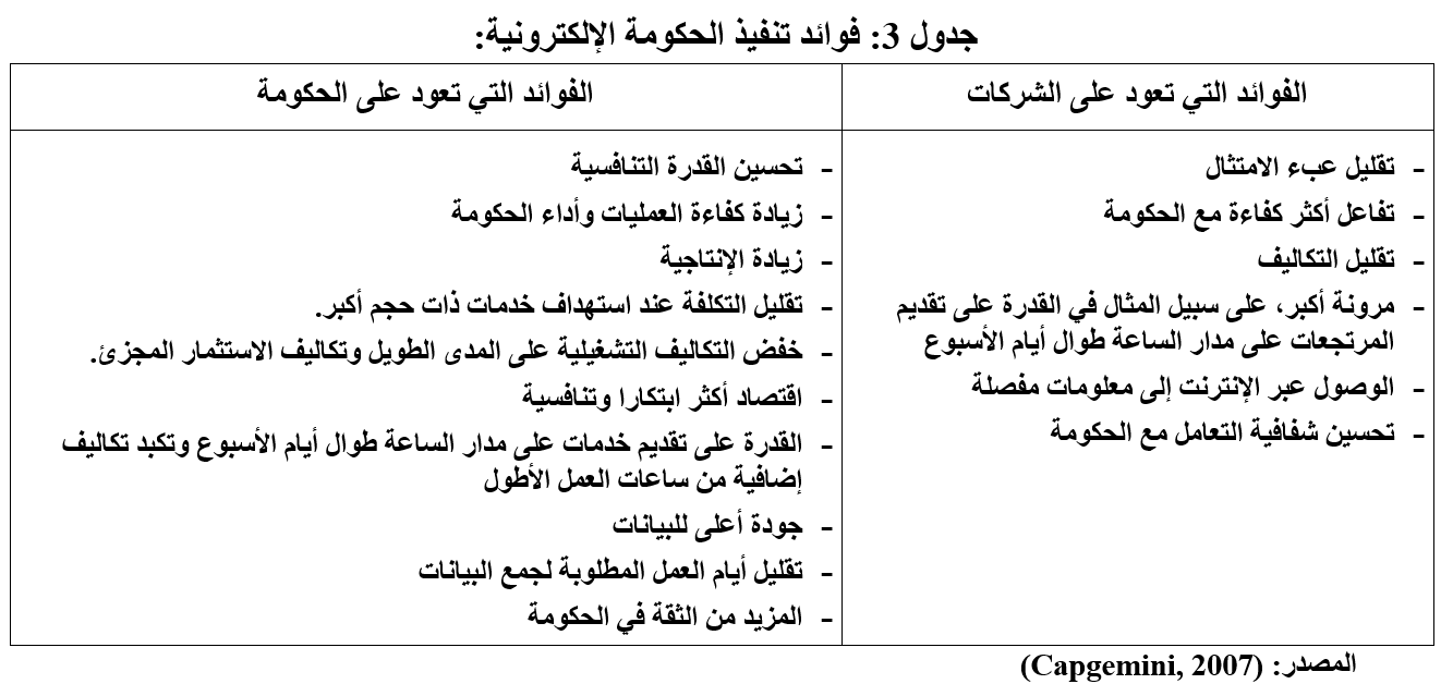 وبخلاف التأثيرات الإيجابية في المواطنين الأفراد فإنَّ تحقق الحكومة الإلكترونية - أيضًا - عددًا لا يحصـى من الفوائد من جانب الشـركات، عندما يكون تنفيذ الحكومة الإلكترونية بنجاح لتكون بمقام إدارة معلومات بين الحكومة وكيانات الأعمال المختلفة، فإنها تخلق إحساسًا وقيمة تجارية؛ بحيث تعزز العلاقات والثقة بين الحكومـة والشـركات المختلفـة، ويبين جدول 3 الفوائد المختلفة للحكومة الإلكترونية الناجحة من جانب الشركات والحكومة نفسها[30].