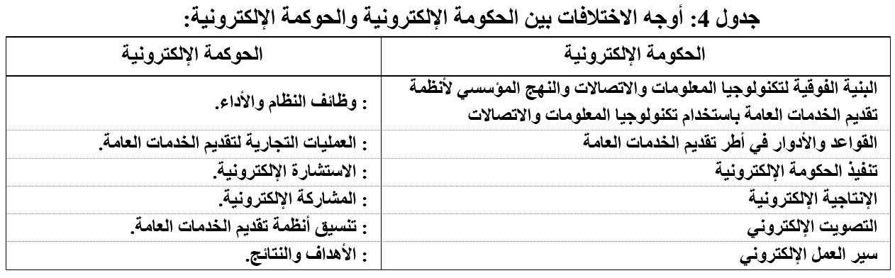 بينما تستلزم الحكومة الإلكترونية استخدام تكنولوجيا المعلومات والاتصالات لتعزيز استجابة الحكومة، وتشمل خصائص مثل سير العمل الإلكتروني، التقييم الإلكتروني، تقديم الخدمات الإلكترونية التي تؤدي في المقابل إلى زيادة الإنتاجية الإلكترونية، بالإضافة إلى ذلك تتضمن الحوكمة الإلكترونية الجوانب الإجرائية للحكومة الإلكترونية، والحوكمة الإلكترونية هي العملية التي تؤدي إلى المشاركة في العمليات الحكومية باستخدام تكنولوجيا المعلومات والاتصالات، وبعض خصائص ظاهرة الحوكمة الإلكترونية ما يلي: الاستشارة الإلكترونية، والتحكم الإلكتروني، والمشاركة الإلكترونية، والتوجيه المجتمعي الشبكي[55]. الاختلافات بين خصائص الحكومة الإلكترونية والحوكمة الإلكترونية موضحة في جدول 4.