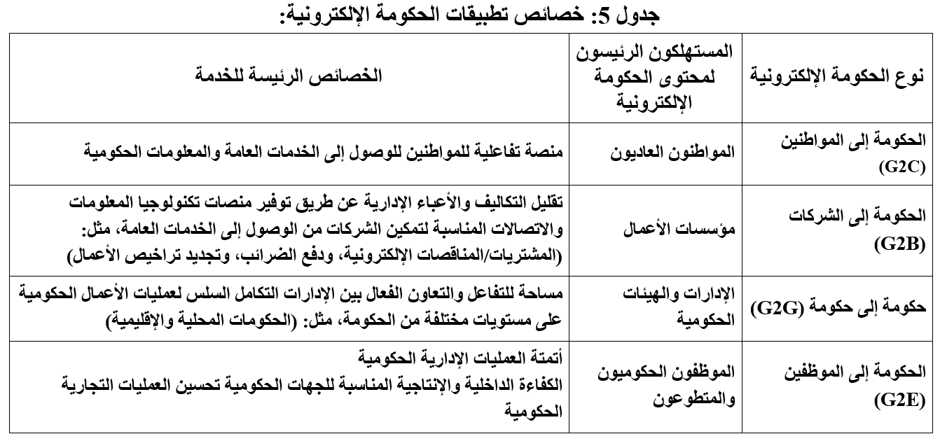 ومن الجدير بالذكر أن جميع تعريفات الحكومة الإلكترونية تكمن في استخدام تكنولوجيا المعلومات والاتصالات في تقديم الخدمات العامة للمواطنين والشـركات ضمن نطاق معين من المجالات كما هو موضح في جدول (1)، ونخلص إلى التعريف الأنسب للحكومة الإلكترونية هو: